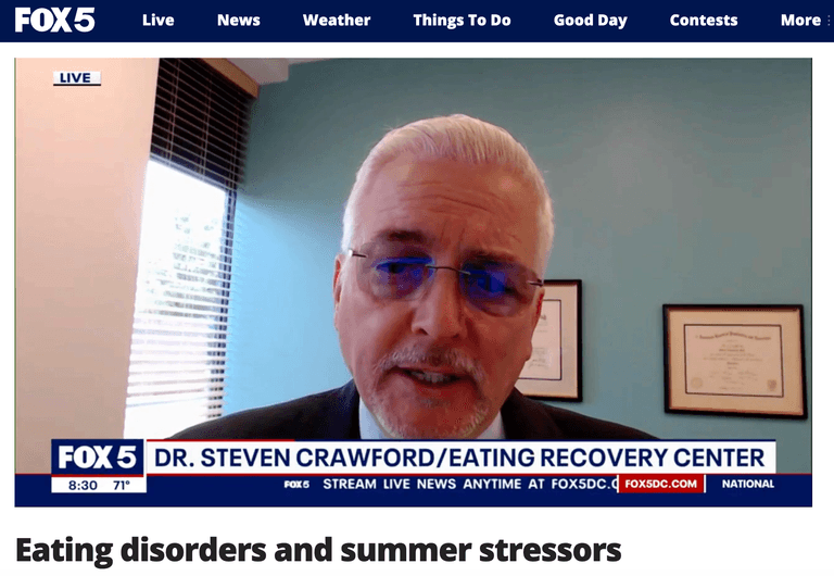 In this Fox 5 Washington DC segment, Dr. Steven Crawford discusses summer stressors and their impact on eating disorders. Dr. Crawford notes summer presents a time when there's less structure and routine (and oversight) and more time spent in places where people compare their bodies, which can lend a hand in problematic behaviors.
