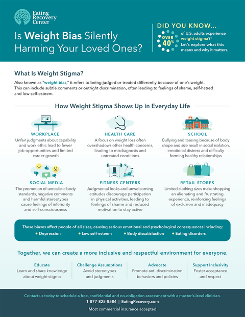 Weight stigma, or ‘weight bias,’ refers to being judged or treated differently because of one’s weight. From subtle remarks to workplace discrimination and biased health care, it often goes unnoticed. But its lasting effects — such as depression, low self-esteem and eating disorders — can’t be ignored. At Eating Recovery Center (ERC), we’re here to help you understand weight bias and what you can do to combat it.